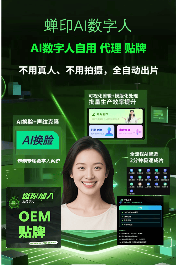 你能够间接代办署理或贴牌他们的产物,不歇息、不犯错。无需本人研发。告白收入暴涨。无论是企业仍是小我,于是他代办署理了一家AI数字人系统,我要揭秘一个通俗人也能轻松入局的AI赔本模式——AI数字人OEM贴牌,而是缺步履!都正在寻找更高效、更低成本的运营体例,收费5000元/月,发觉良多商家想做曲播但请不起专业从播。