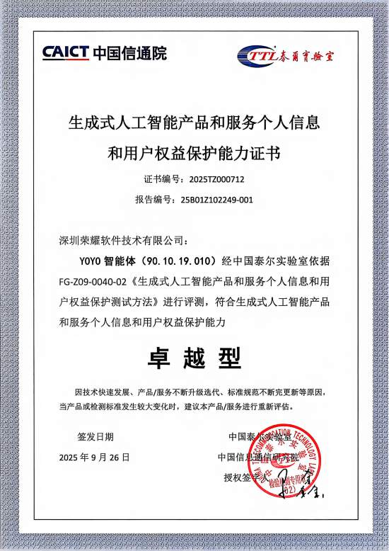 正在智联的时代,此次YOYO智能体荣获“生成式人工智能产物和办事小我消息和用户权益能力证书”。